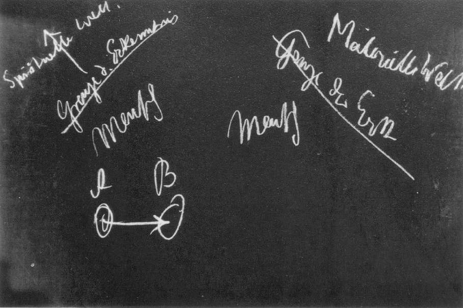 And now we look over to the 19th century. There we see a remarkable fact: in the 1870s, at a famous naturalists' conference in Leipzig, Da Bois-Reymond gave his impressive speech “On the Limits of Natural Knowledge” and soon afterwards “The Seven World Riddles” . What was the question there? (It is drawn.) There stands man, there is the limit of knowledge; but beyond this limit lies the material world, the atoms, that which Du Bois-Reymond says: We do not know what it is that haunts space as matter. — And on this side of the boundary lies that which develops in the human soul.