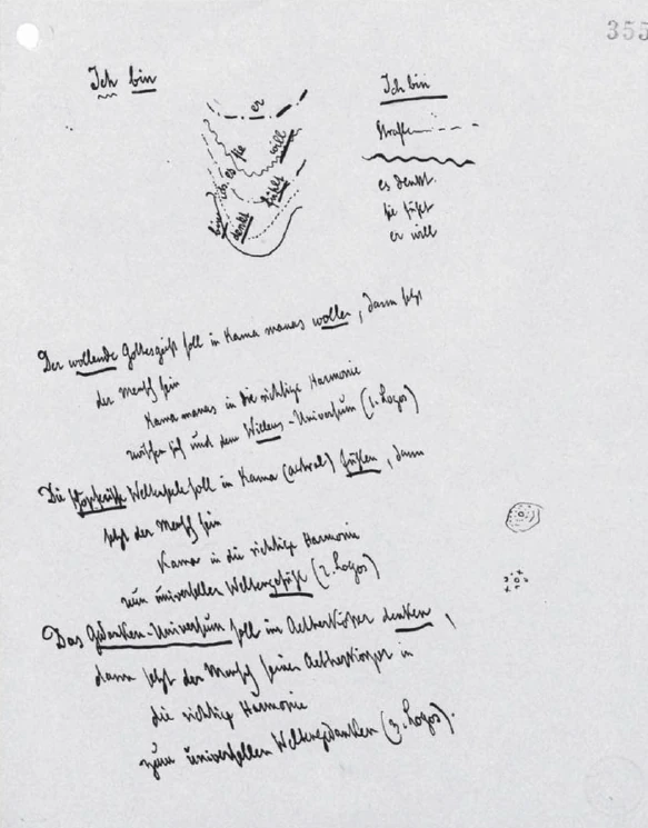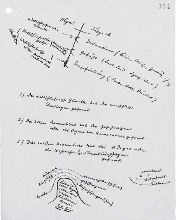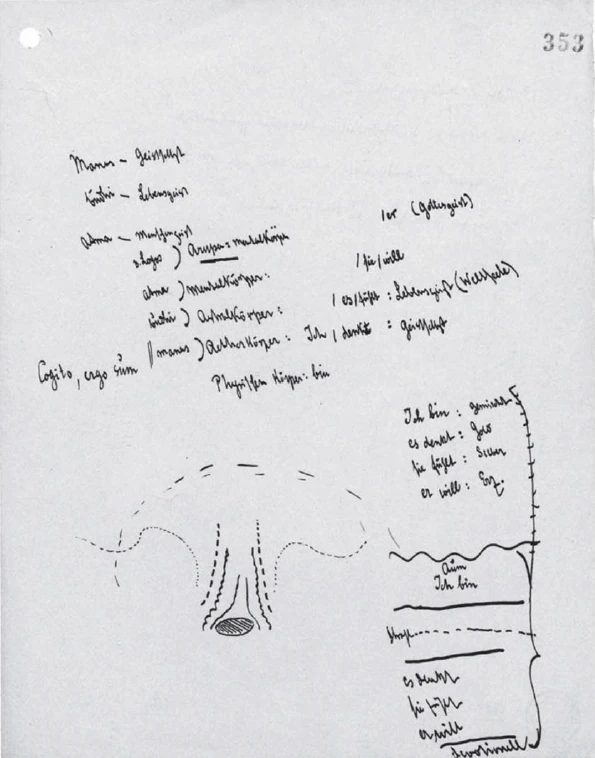 Es denkt Nervensystem Gehirn / Sie fühlt Gefühlsorgane / Er will Wahrnehmungsorgane Sinne / Leib mit allen Organen welche den niederen Functionen dienen. / Ich bin