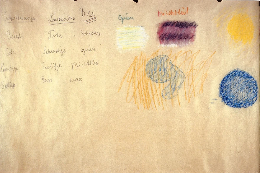 If we take the colors we found yesterday, we can say the following: Green actually always allows us, through its own essence, to do this within certain limits. Green can be limited, so to speak; we do not find it unpleasant when we paint a green surface and give it boundaries. But imagine doing the same with peach blossom. In a sense, this cannot be reconciled with painterly sensibility: peach blossom with boundaries. Peach blossom can really only be applied as a mood, without reflecting on boundaries, without actually intending to have boundaries. If you have a sense of color, you can experience this. Think, for example, of any green color: it is quite easy to imagine gaming tables with green covers. Because gaming is a limited, pedantic activity, something primal and philistine, it is possible to imagine such an arrangement, a room with gaming tables covered in green. But I think it would be enough to make you run away if someone invited you to play tarot on tables with purple inlays. On the other hand, in a purple room, for example, which is entirely wallpapered in purple, it is quite possible to Let's say, mystical talk, in the best and worst sense. In this respect, colors are not anti-moral, but amoral. So we notice that something follows from the nature of color itself, that color has an inner character, whereby green can be limited; purple, peach blossom, and incarnate tend to blur into the indefinite.