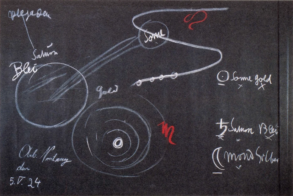 And so we get a metal for each planet. And that is why the Babylonians and Assyrians wrote the sun with this sign:®. But they also wrote gold with this sign. They knew that the stars no longer have any influence on the minerals now that the earth is there, but they once had it. They wrote the sun and gold like this:®. We write the sun and the gold with the letters that are in our alphabet; but the ancients always made this sign:®. They also did not write “lead”, but they made this sign:, and that means both Saturn and lead. It would not have occurred to anyone in ancient times to write Saturn or lead with ordinary letters. If he wanted to write that, he wrote this sign Ahin. If he wanted to write “silver,” he wrote this sign: C. That means both the moon and silver. So that the Earth, insofar as it is metallic, was also related to the stars.