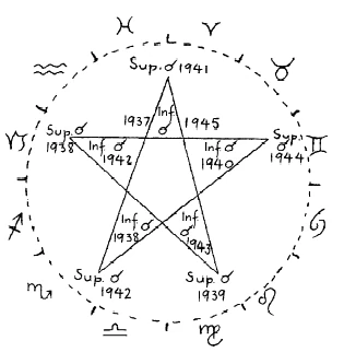 The last loop and also the culminating event, which was the inferior conjunction, took place at this corner about Easter 1937. Four years later, about Easter 1941, a superior conjunction occurred in approximately the same position.