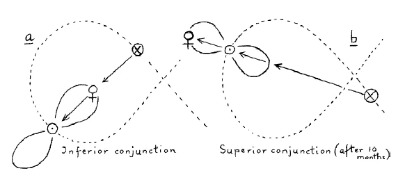 We now have to imagine the planets Venus and Mercury as moving upon smaller lemniscates, perhaps fixed by their crossing points upon the Sun-Earth-lemniscate but with the possibility of movement from the right side of the Sun to the left and also the reverse. Thus we find a reason for the fact that the planet Venus is sometimes in front of the Sun (seen from the Earth) and moving against the direction of the Sun’s movement (that is, being retrograde or performing a loop), and at another time (about 10 months later) it is behind the Sun or in superior conjunction (see position b in the diagram).